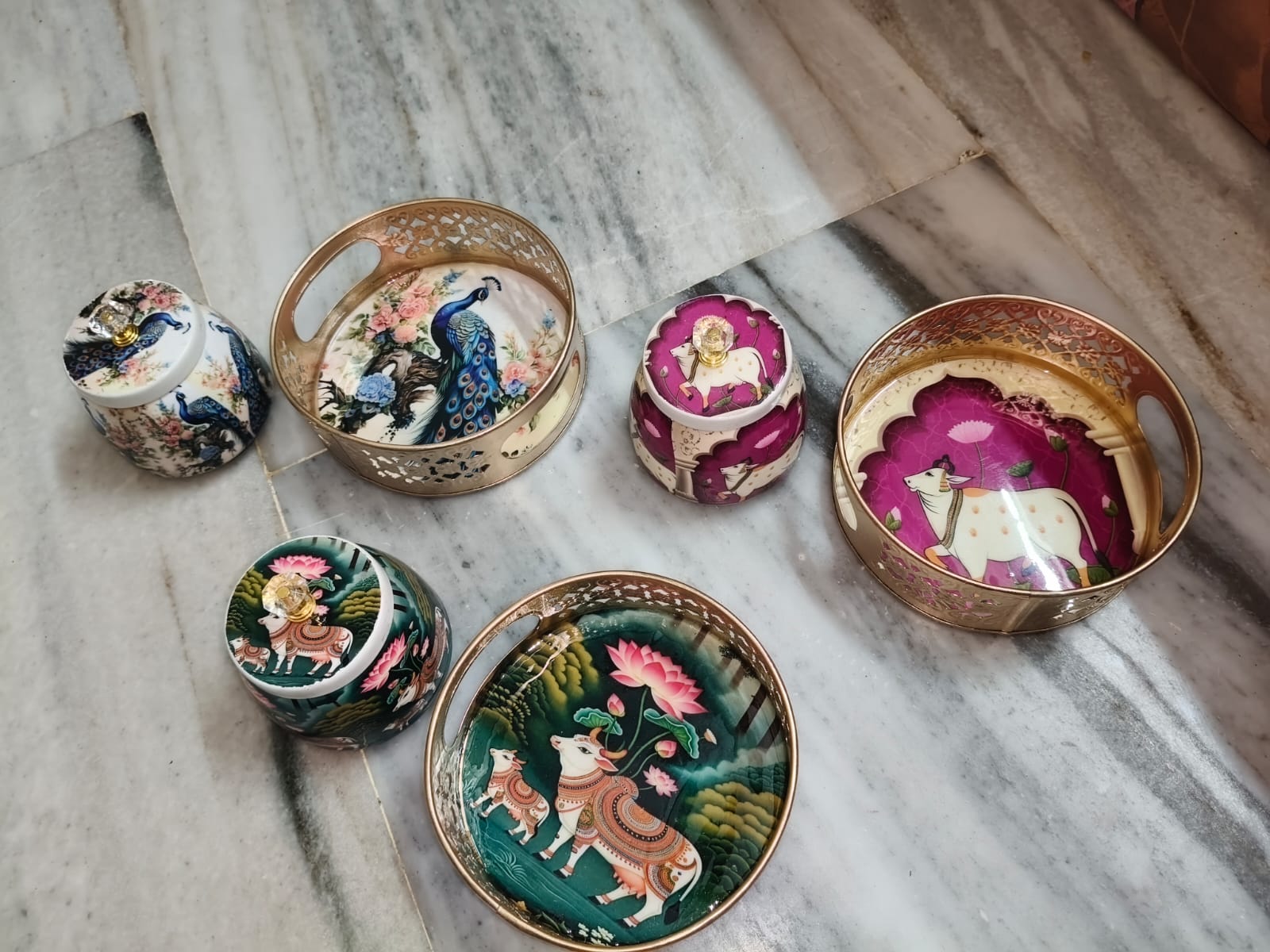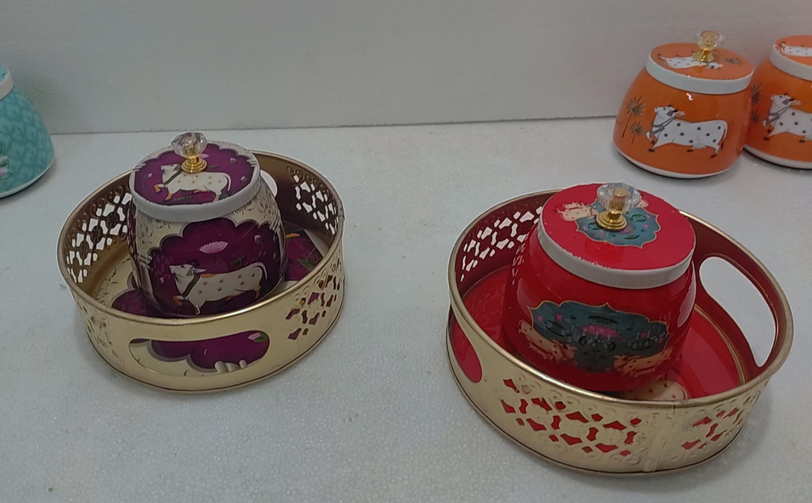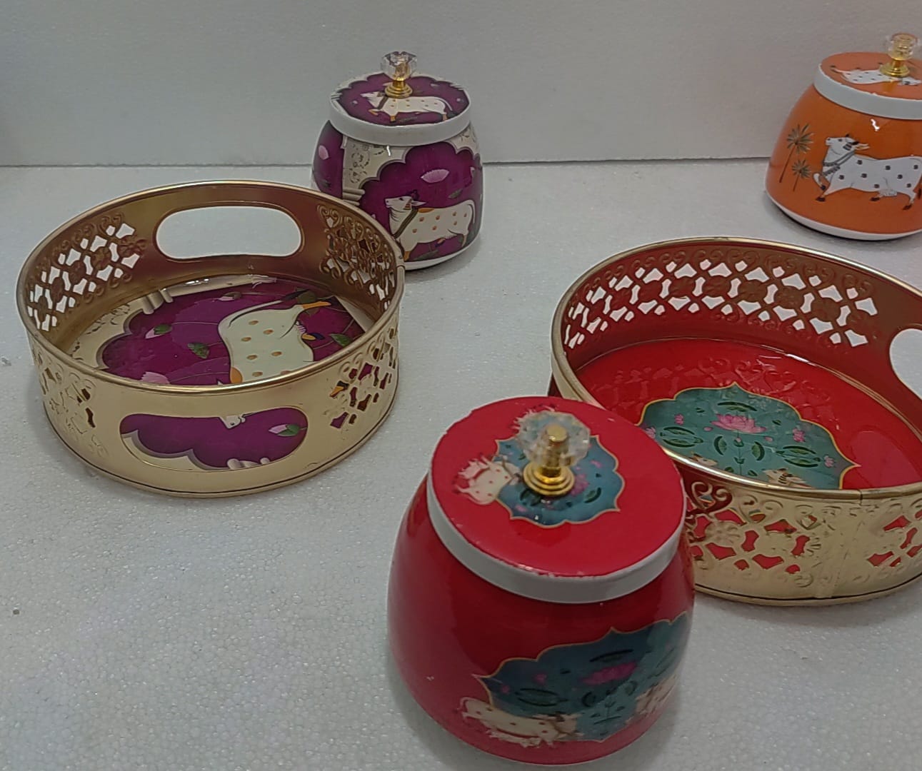 Pichwai jar basket set with 4 inch jar and 6 inch in Unique Pichwai cow prints come in single box packing
